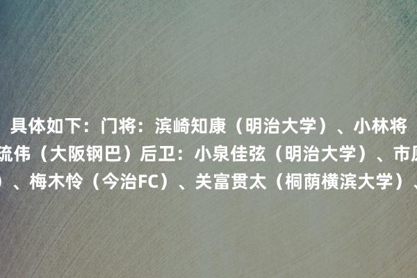 具体如下:门将:滨崎知康(明治大学)、小林将天(东京FC)、荒木琉伟(大阪钢巴)后卫:小泉佳弦(明治大学)、市原吏音(RB大宫松鼠)、梅木怜(今治FC)、关富贯太(桐荫横滨大学)、永野修王人(鸟取但愿)、土屋櫂大(川崎先锋)、冈部飒斗(东瀛大学)、森壮一朗(名古屋鲸)中场:大关友翔(川崎先锋)、小仓幸成(法政大学)、石渡尼尔森(大阪樱花)、佐藤龙之介(冈山绿雉)、嶋本悠大(净水心跳)、川合德孟(磐