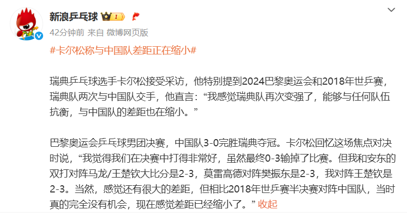 赛场外,另一位瑞典乒乓球名将的言论激发正常缓和,卡尔松在秉承采访时直言:“我嗅觉瑞典队再次变强了,省略与任何军队抗衡,与中国队的差距也在收缩。”