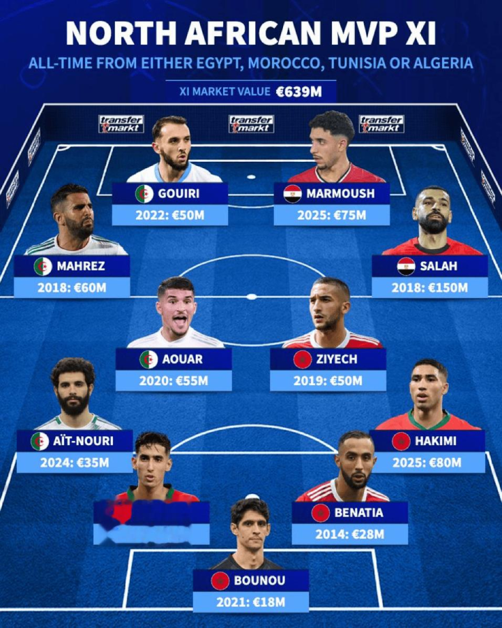中场:奥亚尔(阿尔及利亚,5500万欧)、皆耶赫(摩洛哥,5000万欧)、马赫雷斯(阿尔及利亚,6000万欧)、萨拉赫(埃及,1.5亿欧)