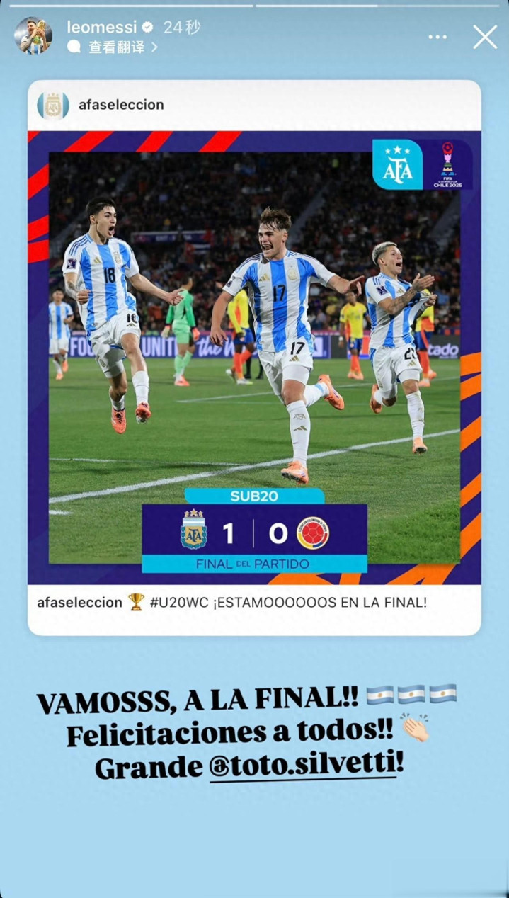 阿根廷国度队队长梅西第一时辰发文,恭喜了球队。梅西写说念:“加油!进决赛了!!道贺通盘东说念主!你太棒了,西尔维蒂!”